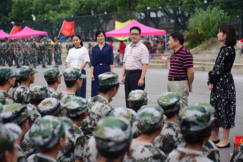 院长彭祝斌、党委书记胡建国、党委副书记兼副院长程华、院长助理谢莹及18级辅导员刘佳深入军训场地向教官和新生表示慰问。