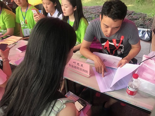 从下午两点半到六点半,作为首位进行答疑的叶思展老师,在迎新点一坐就是整整一个下午。叶思展老师从教于广播电视编导专业,人称“叶帅”,虽然他长得年轻,但在新影院从事教学工作已有十六年了。他悉心地为同学们介绍专业课程情况及转专业政策,帮助新生及家长在第一时间了解银河娱乐官网
